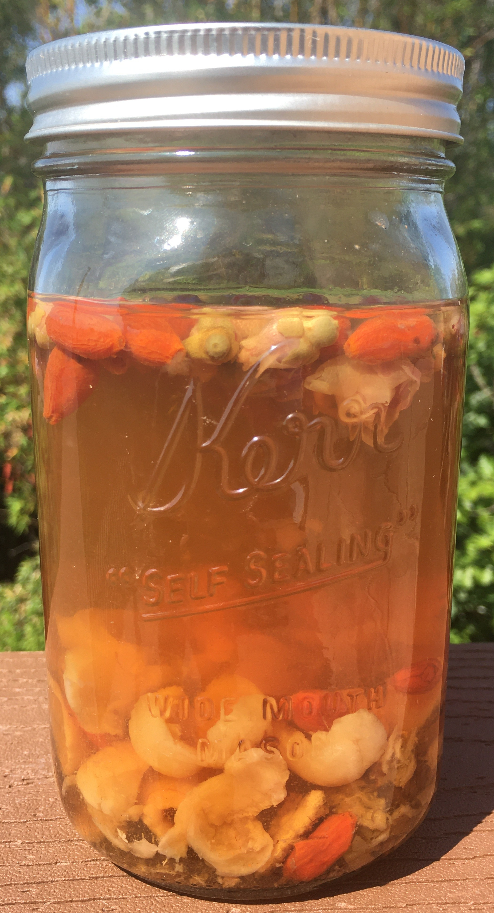 - Pour almost boiling water over the herbs and fill to the top. Lid and let sit overnight.