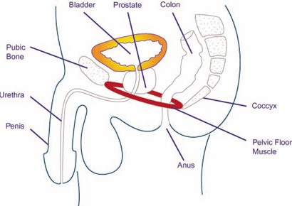 In a sitting position, blow strongly into a balloon or mime the same action. You will feel a region in the lower pelvis that comes into play as you blow. This is the pelvic floor region.